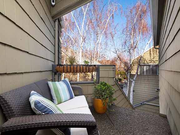 Fantastic Harbortown opportunity to own waterfront penthouse style unit. Upgraded kitchen has newer cabinets, counters and lighting. Updated guest and main baths. Soaring ceilings, abundant wall space for art, skylight in kitchen make it light & airy. Wood burning fireplace in living room. Both dining & living room overlook lagoon. Large 2nd bedroom (could be at home office) & spacious primary bedroom both have great closet space & overlook greenbelt with abundant trees & shrubs. Washer/dryer facilities in unit. Private corner unit with south westerly views of SM Lagoon and hills. Detached one car garage with additional storage. Harbortown has clubhouse, 3 pools, spa, 2 tennis courts, community garden, sport court & kayak storage. Great walking paths plus centrally located, Harbortown complex is DOGGY friendly.
