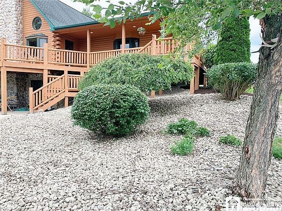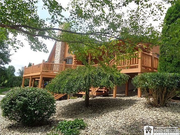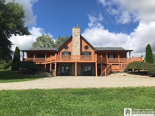 Set amongst the rolling hillside in the heart of Chautauqua County with panoramic views! 4 bedroom log home on 17.5 acres! The master suite has own walk in closet,private bathroom with Jacuzzi tub & walk in tiled rainfall shower, & private access to sweeping front wraparound porch! 2 more bedrooms are at other end of home with own private bathroom. A loft bedroom is 4th, it has it's own private balcony! The vaulted greatroom has stone fireplace, access to wraparound porch, beautiful wood staircase to loft above! 1st floor laundry room with window, complete with washer/dryer is so handy! Kitchen has views of countryside, built in stainless steel appliances, solid surface counters & gorgeous wood cabinetry! An enclosed gleaming wood staircase leads to full basement below that is partially finished with bathroom, heated floors & sliding doors to outside. Poured basement walls, Radiant heated floors throughout, tankless water system, central A/C. Entire exterior stained July 2020. 2000' more feet of heated living space in basement! Wraparound porches, & balcony offer northern, east & western hillside views! Amazing, turnkey property showing pride of ownership! Country lovers dream!
