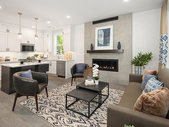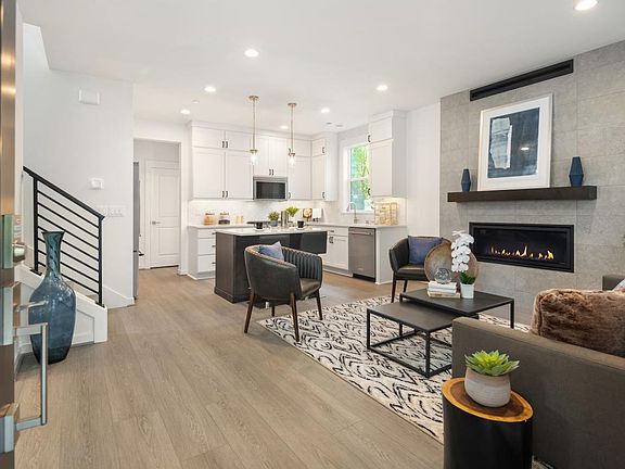 The thoughtfully designed kitchen features beautiful 3cm off-white quartz countertops with subtle grey veining, white shaker double-stacked upper cabinets, a contrasting graphite-colored stained island, and a striking 3x12 herringbone tiled backsplash. A floor-to-ceiling wrapped tile surround on the gas fireplace creates a stunning focal point as you enter, adding warmth and sophistication. Nestled in a lush green forest, this home offers a private and secluded feel. The entire second floor is your luxurious primary suite a serene retreat with vaulted ceilings, a spa-inspired bathroom, dual vanities, and a large window that fills the space with natural light. Additional conveniences include an attached garage with an EV outlet. Disclaimer: Photos are images only and should not be relied upon to confirm applicable features.