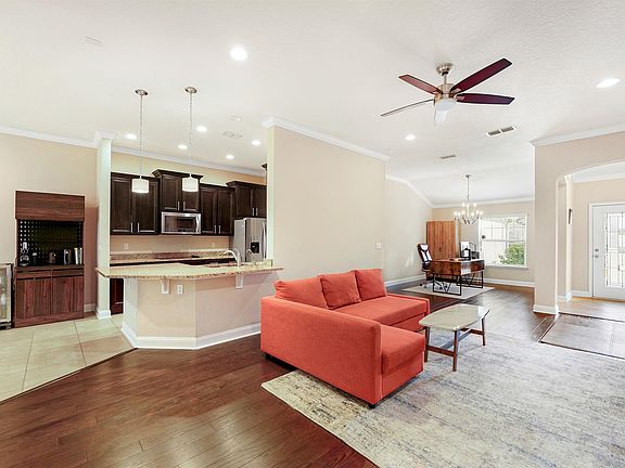 This beautiful 2015 home features a stylish stucco and ledgestone exterior. Inside, enjoy elegant details like pendant lighting, crown molding, and a bay window. The master bedroom offers a luxurious double-step tray ceiling. The gourmet kitchen is perfect for cooking and entertaining, with a stackable oven, bar top, and stainless steel appliances. Located in the desirable Parkside Lakes community, this home offers peaceful living with easy access to I-295, downtown Jacksonville, St. Augustine, and the beaches. All information pertaining to the property is deemed reliable, but not guaranteed. Information to be verified by the Buyer. Be advised that cameras may exist recording audio and video inside/outside the property, such as ring doorbells. Photos are digitally enhanced and could be altered, please verify.