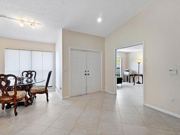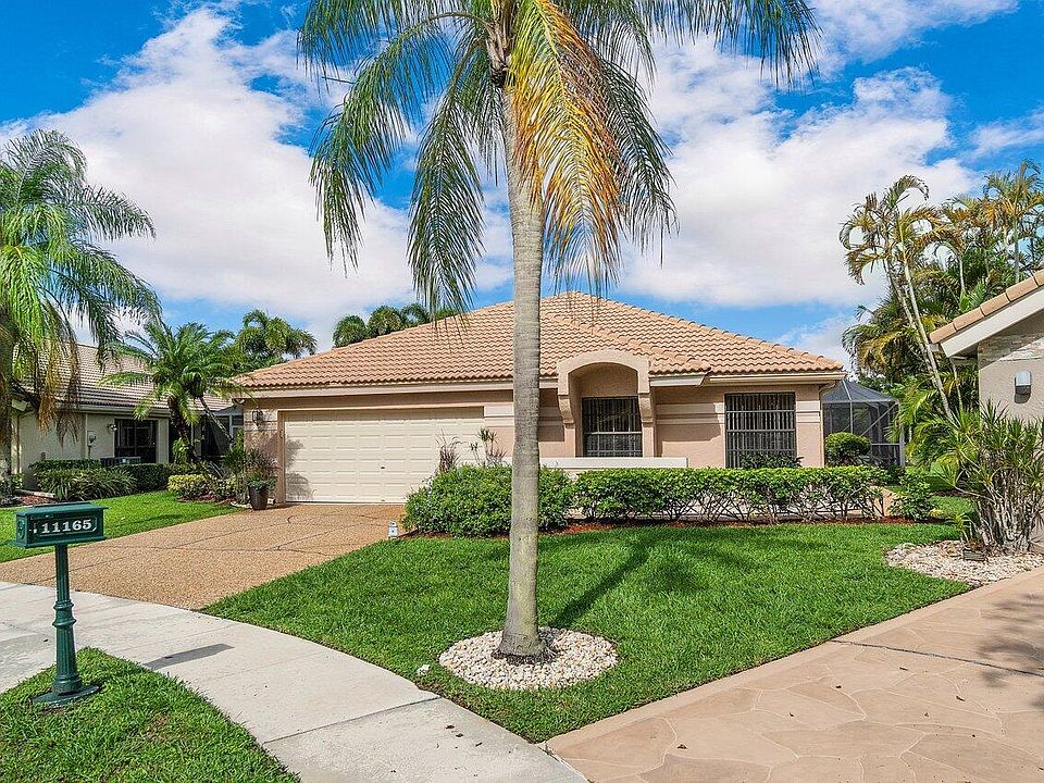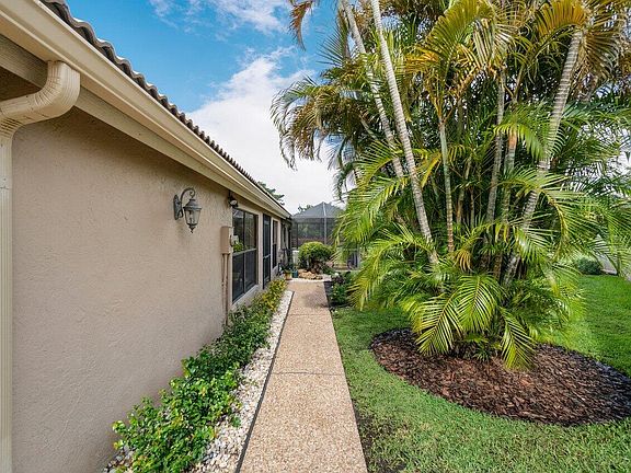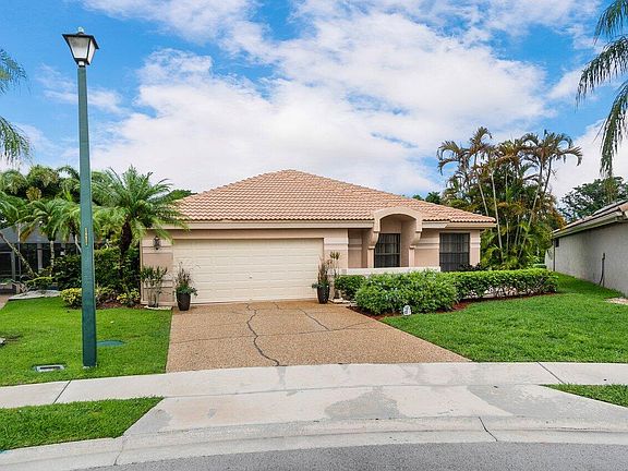 This home has fantastic natural light, vaulted ceilings, and is super spacious with a huge great room overlooking a large green space of the 5th hole on the golf course. It has a large lot on a quite cul de sac w/ 3 bedrooms, 2 baths, all tile throughout, 1 private screened in covered patio, and another open screened in patio both w/ beautiful golf course views. The roof is 2006, A/C & water heater are 2017, & the 2 car garage has been converted to a 1.5 but could be converted back. Boca Woods is a 24 hour manned gated community and offers two 18 hole golf courses, driving range, tennis & fitness center, pool, pickle ball, dining, & much more. It has a Mandatory Membership of $65,000 and $30,000 refundable when you sell, dues $16,215 +tax/yr - minimum in dining room $1,000 +tax/yr.