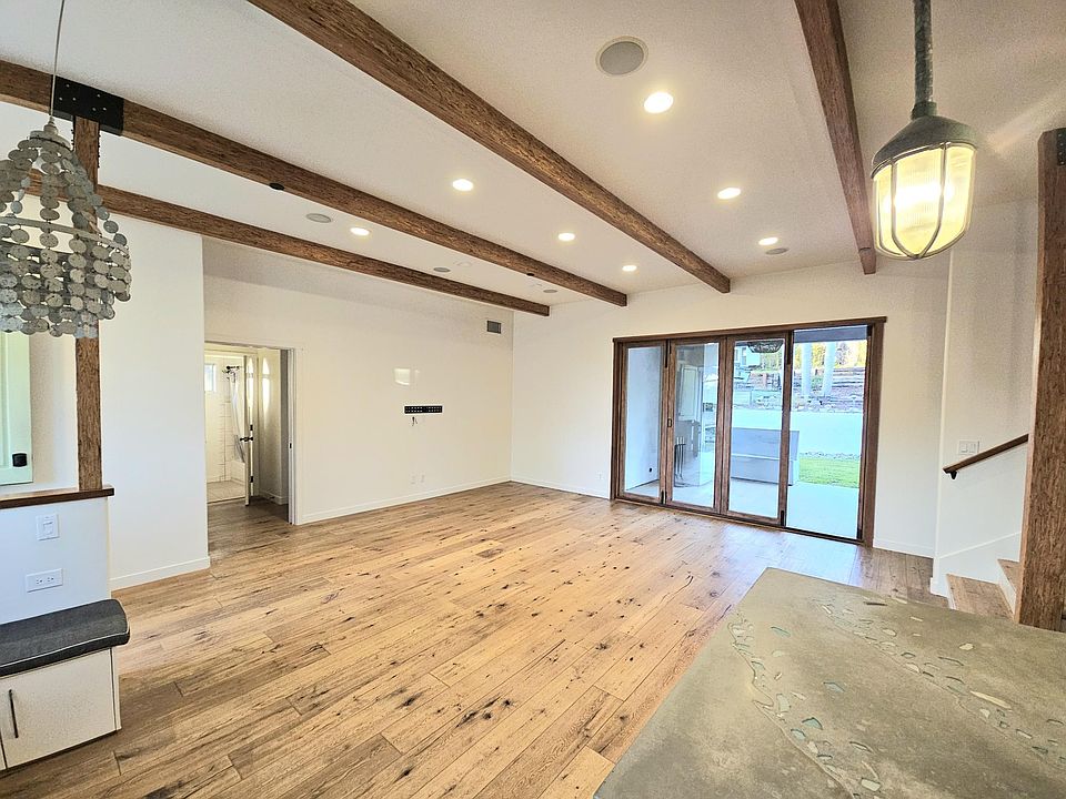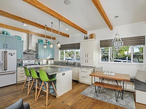 Welcome to Paradise! A Stunning Sunset/Ocean View Custom Cardiff Home recently rebuilt. Designer touches throughout with extra attention to every fine detail. Beach Glass Concrete kitchen counter tops, 10' exposed beam ceilings, Engineered Duchateau oiled hardwood floors, Vintage Island pendants from now defunct Long Beach ship yard. La Cantina doors opening to indoor/outdoor area with wood burning fireplace. Detached Office/Bonus Room with hardwood floors, huge multi leveled yard with beach sand. Custom designed and built in 2012 with all new plumbing, electrical, water heater, windows, roof, doors. Custom 42" dutch door with zero threshold, ADA entry Engineered Duchateau oiled hardwood floors Custom kitchen island with embedded beach glass. Custom fireplace mantel in concrete GE Cafe refrigerator with hot water feature Drawer microwave in island Soft close Blum hinges on all kitchen cabinets Vintage island pendant and master bathroom pendants from now defunct Long Beach Ship Yards La Cantina Doors in living room creating inside/out space Wood burning fireplace on outside deck with custom tile and custom built-in hearth bench Master Bath tub MTI freestanding soaker Master Bath fixtures high end chrome imported from Italy Master bed with wall custom walk-in closet, ocean view from bed, deck, and Pella sliding door with internal blinds Custom shutters in downstairs bedroom and upstairs bedrooms long term preferred. Short term 30+ days available for nightly rate