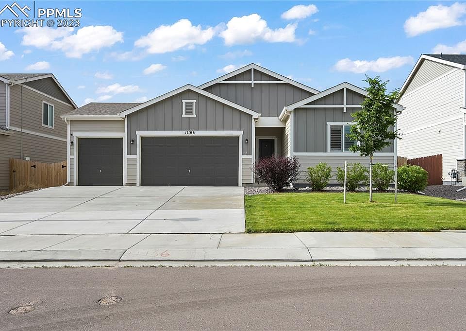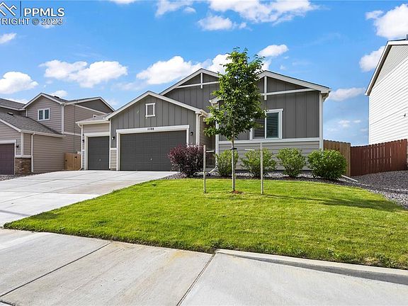 Gorgeous and incredibly clean rancher in Lorson Ranch! This home was built in 2020, so it is nearly new. As you drive up, you will see a three car garage, with plenty of space for storage or a home gym and landscaping in the front yard. Then as you walk in the front door, you are greeted by 9 foot tall ceilings, an open floor plan, and so much natural lighting. You will see 2 bedrooms and a full bathroom in the hallway then an open kitchen with gas stainless steel appliances and a walk-in pantry. Off of the living space, there is a large primary room with an attached bathroom and a walk-in closet. As you step out back, you’ll notice the gorgeous views of open space that the home backs up to. Schedule to see this beautiful home today!