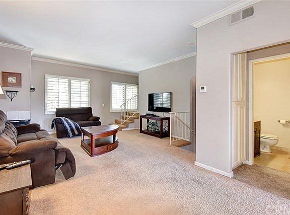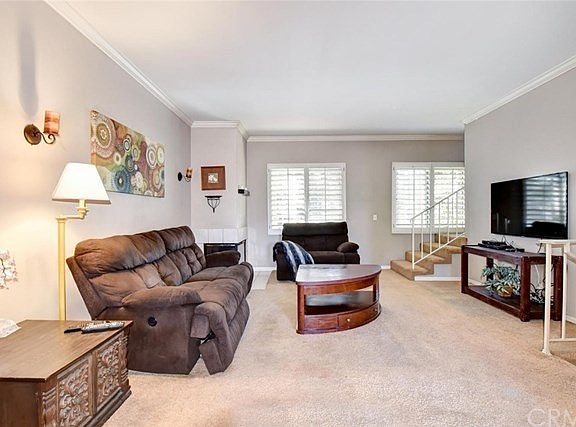 Beautiful curb appeal with tropical landscaping in the front of complex. Custom plantation shutters and earth tone carpet throughout. Spacious Living room with corner wood or gas burning fireplace. Crown mouldings thru-out! Dining Room with slider leading to outdoor private patio. Gourmet kitchen with beautiful white cabinets, pantry, gas range, oven, microwave, dishwasher & plenty of counter space. Double door entry to Large Master Suite with wall to wall mirrored wardrobe doors. Lounge area, crown molding & luxurious bath with dual sinks and separate oval tub and shower. Second Master Suite with elegant bath, walk-in wardrobe closet, and private patio retreat . Huge 2 car Attached garage with direct access. Separate laundry room that includes washer and dryer. Stroll to local parks, shopping, restaurants. Top rated Los Alamitos Schools just minutes away.