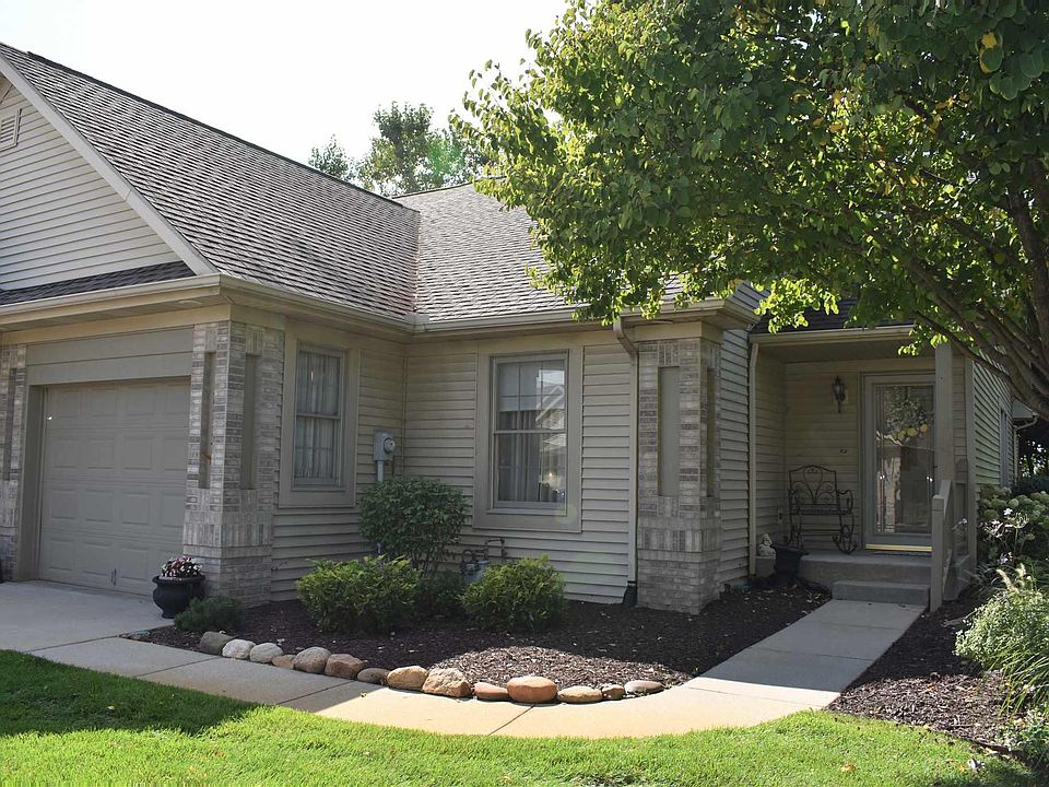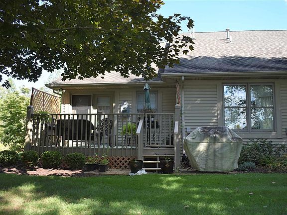 Condo located on the end with wooded area beside so it feels nice and private. Shaded deck perfect for relaxing afternoons. Open concept great room open to kitchen with breakfast bar. Two nice sized bedrooms, 1 and 1/2 baths. Appliances are included, newer stainless refrigerator. Association fee is paid quarterly and takes care of exterior maintenance, lawn, sprinklers and snow removal. Newer water heater. Stairway to the crawl space with room for storage. Schools, sq. ft. and measurements not warranted.