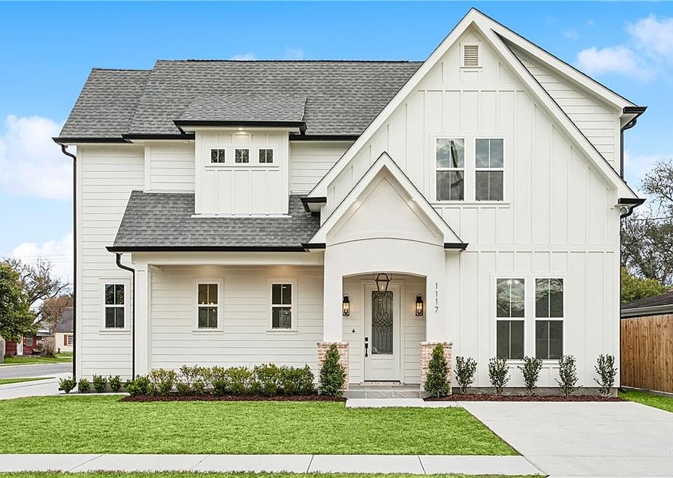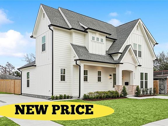 NEW 5 BD 4 BA modern farmhouse sit on a CORNER lot with SLATE porch, 22” COPPER GAS lantern & OLD CHICAGO brick columns. Step into this CUSTOM built home designed w/GOLD finishes, NATURAL wood tones & reclaimed ANTIQUE doors that showcase rare woodwork with Art deco mosaic & stained glass. Captivating kitchen w/CALACATTA GOLD QUARTZ, honed marble backsplash, 36” VERONA gas stove, custom hood, pot filler, BOSCH dishwasher & SHARP microwave drawer. A stunning 42” DOUBLE WATERFALL island with farmhouse sink, bell glass shaped pendants & seating. One of a kind dining has 11 ft CRISSCROSS COFFERED ceilings, French Oak & Champagne gold farmhouse CHANDELIER & WET BAR featuring a wine rack & built-in wine display niche. Enjoy entertaining in the OPEN LIVING room which features a beautiful FIREPLACE with Cypress mantle surrounded in shiplap & Quartz. Exquisite 1st floor PRIMARY SUITE offers a walk-in closet, 2 independent white quartz vanities & matte black finishes. Relax under your CRYSTAL CHANDELIER in your 71” SOAKER tub w/built-in wall niche & handheld shower, or enjoy the RAINFALL SHOWER system w/a frameless CORNER glass enclosure. Includes 1st floor guest bedroom/office + full bath designed w/EGYPTIAN reclaimed door, marble farmhouse vanity, lattice mosaic flooring & walk-in shower. UNIQUE HIDDEN pantry & laundry area behind the sliding antique door opens to an Enchanted Forest green shiplap wall, crown molding & shelving. ALL 3 upstairs bedrooms include WALK-IN CLOSETS, 2 of which feature DESK/NICHE AREAS & the 3rd has 11 ft ceilings w/a 60” ceiling fan. Host outdoor gatherings by adding a kitchen or indulge in quiet evenings under the COVERED PATIO & private backyard surrounded by a 6 ft tall cedar fence. ADDITIONAL FEATURES: Luxury vinyl wood flooring, White oak stairs, staircase chandelier, GUTTERS, tankless water heater, 2 Nest cameras, Ecobee thermostats, slab built on PILINGS, Showcase windows & 2 ATTICS! Plenty of parking w/front driveway & side circular drive