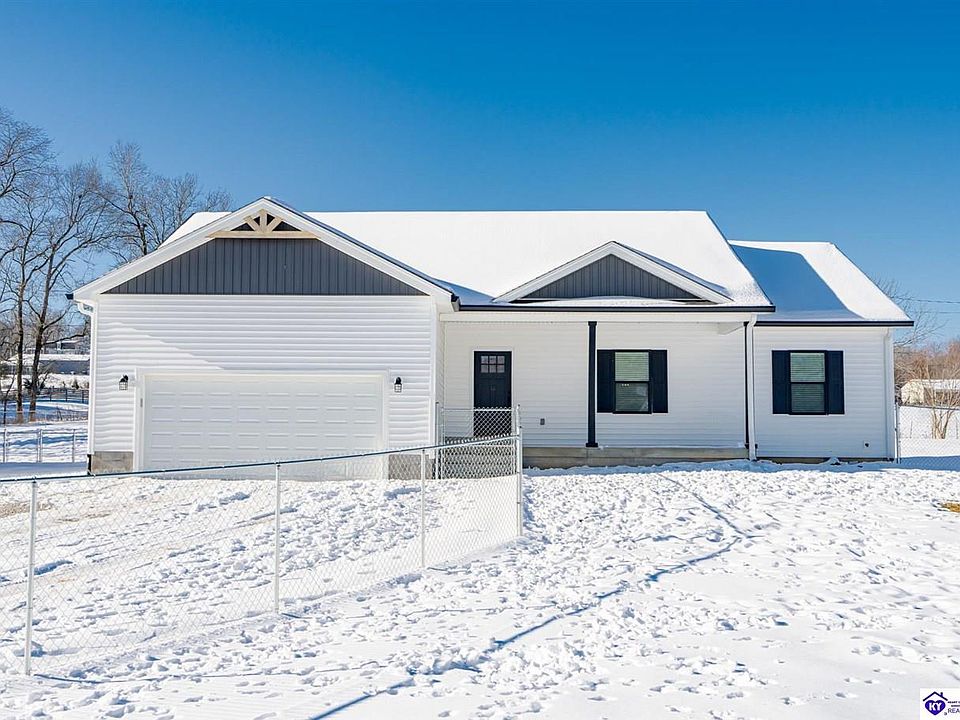 Welcome to 1117 Kirchdorfer Rd in Brandenburg! This 2023-built home offers the perfect combination of modern design, comfort, and convenience. Featuring 3 bedrooms, 2 bathrooms, and an attached 2-car garage, this property is ideal for those seeking space and style. Step inside to find an open floor plan designed for easy living and entertaining. The home is equipped with spray foam insulation for energy efficiency and year-round comfort. Situated on a spacious 0.9-acre lot just outside of Brandenburg, the property boasts a large fenced yard perfect for pets or outdoor activities. Relax and enjoy the views from the expansive covered front porch, ideal for morning coffee or evening gatherings. Conveniently located just 35 minutes from Elizabethtown, KY, and close to Fort Knox, the BlueOval SK Battery Park, and only 50 minutes to Louisville International Airport, this home provides easy access to key destinations while maintaining a peaceful, rural setting. Don’t miss your chance to make this move-in-ready gem your next home!