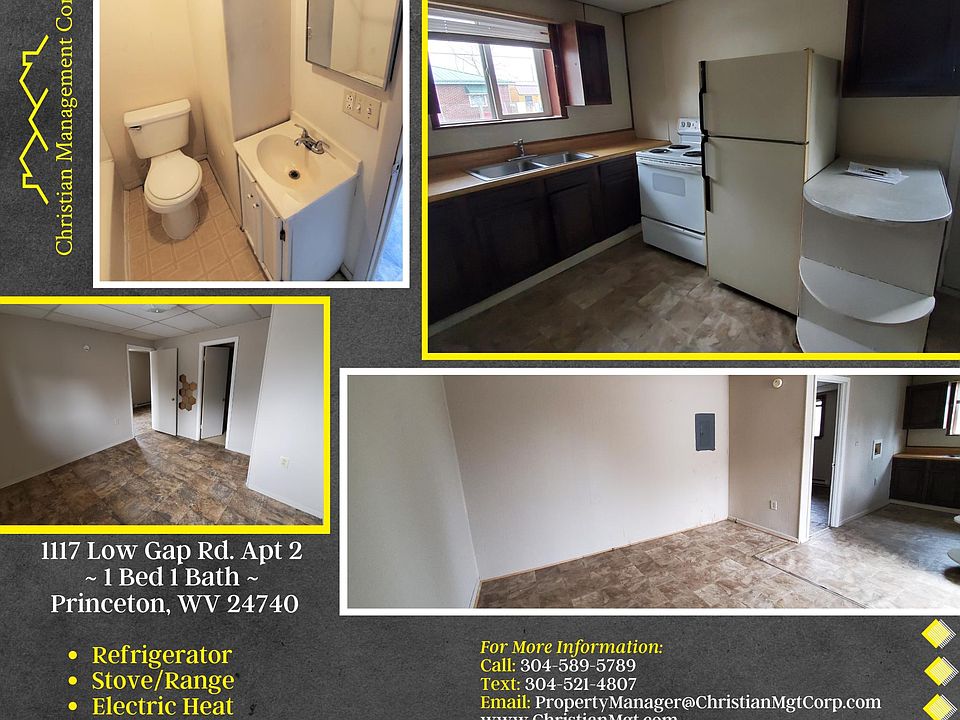 1117 Low Gap Rd. Apt 2 ~ 1 Bed 1 Bath ~ Princeton, WV 24740 RENTAL: Security Deposit: $495. Can be made in payments if needed. Monthly rent: $495/month. No utilities included. This building is located at the corner of Low Gap Road and Thornton Avenue. This cozy 1-bedroom 1-bathroom apartment is in a small, quiet building with a new roof and new siding. Off-street parking is available. The kitchen includes a refrigerator & stove. Washer & dryer hook-ups are available for laundry. You can stay cozy this winter with the included baseboard heat! This location is a short drive from Mercer Street in Downtown Princeton, where tenants can experience all the sites, shops, and events this city has to offer! You'll also be minutes away from all of the restaurants and grocery stores on Stafford Drive! Christian Management Corporation Office Hours: Mon-Fri 9:00AM-5:00PM & 10:00AM-2:00PM the 1st Saturday of every month You can view THIS property 7 days a week! Most pets welcome with a $300.00 pet fee per pet and signed pet agreement. Maximum 2 pets. No aggressive breeds due to insurance restrictions. Clean, safe, quiet, crime & drug-free are our priorities for our residents! We support Equal-Housing Opportunities! Good people with good, bad, low, or no credit but stable employment or Social Security are welcome. -MUST pass background check -NO evictions in the last 7 years -NO sex offenders Is this property not what you are looking for? View our other available #homes, #mobilehomes, #apartments, and more on our Facebook or our website!