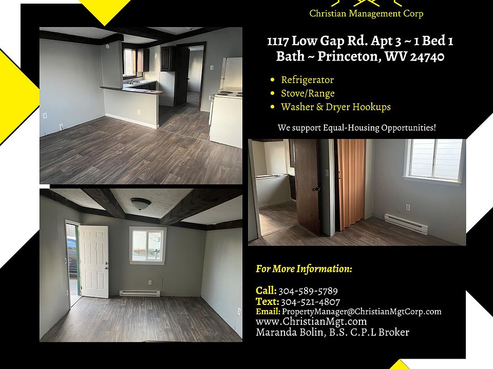 1117 Low Gap Rd. Apt 3 ~ 1 Bed 1 Bath ~ Princeton, WV 24740 RENTAL ONLY: Security Deposit: $495. Can be made in payments if needed. Monthly rent: $495/month. No utilities included. This building is located at the corner of Low Gap Road and Thornton Avenue. This cozy 1-bedroom 1-bathroom apartment is in a small, quiet building with a new roof and new siding. Off-street parking is available. The kitchen includes a refrigerator & stove. This location is a short drive from Mercer Street in Downtown Princeton, where tenants can experience all the sites, shops, and events this city has to offer! You'll also be minutes away from all of the restaurants and grocery stores on Stafford Drive! Christian Management Corporation Office Hours: Mon-Fri 9:00AM-5:00PM & 10:00AM-2:00PM the 1st Saturday of every month You can view THIS property 7 days a week! Most pets welcome with a $300.00 pet fee per pet and signed pet agreement. Maximum 2 pets. No aggressive breeds due to insurance restrictions. Clean, safe, quiet, crime & drug-free are our priorities for our residents! We support Equal-Housing Opportunities! Good people with good, bad, low, or no credit but stable employment or Social Security are welcome. -MUST pass background check -NO evictions in the last 7 years -NO sex offenders Is this property not what you are looking for? View our other available #homes, #mobilehomes, #apartments, and more on our Facebook or our website!