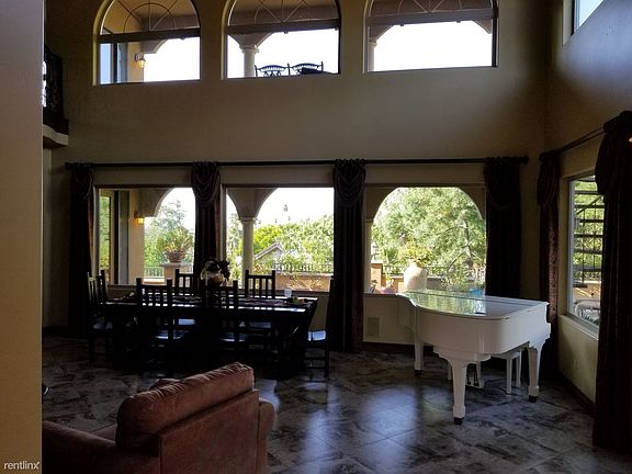 This beautiful custom Mediterranean View Home is located in a gated enclave in Canyon Crest. Enter through the hand notched alder wood doors into a two story Foyer and living area which features porcelain tile with stone inlay, three fireplaces (one dual sided), wrought iron décor & railings, whole house sound system, wine cabinet, whole house water purifier and custom paint with murals that complement its architectural style. The Living Room has large windows boasting city & mountain views, outdoor fireplace, spa and putting green. The Dining Room with Butler Pantry (currently housing a pool table) leads into a spacious Kitchen with alder wood cabinetry, granite counter tops and stainless steel appliances including a professional grade DCS double oven, double dishwasher and two large sinks, then opens to the Family Room featuring a large fireplace. The entry level Master Suite has its own cozy fireplace and large Master Bathroom with a jetted tub and extra-large shower. Upstairs there are 3 Bedrooms, a Loft and Veranda that provides a tranquil spot to relax enjoy the views. If you have been looking for a home with a "Wow" factor, you will find it here! Be sure to click on the virtual tour for an aerial view of this stunning property.