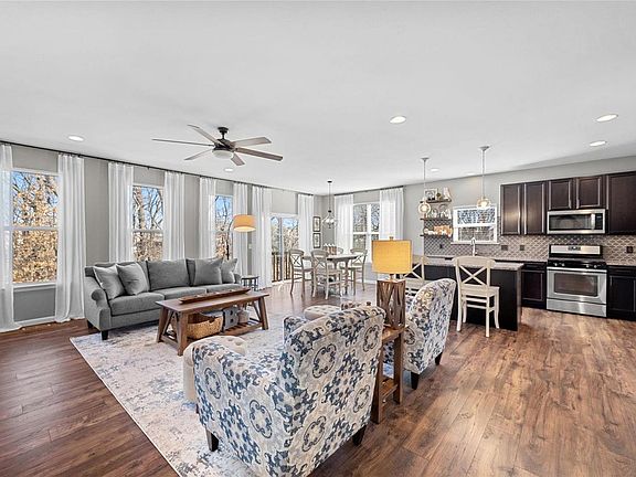 This stunning ranch home built in 2018 is located on a quiet cul-de-sac and backs to trees for perfect privacy! Tall 9' ceilings, open floorplan, luxury vinyl plank floors throughout & updated lighting. Beautiful kitchen w/ upgraded espresso cabinets, under cabinet lighting, center island, granite counters, custom tile backsplash, & SS appliances with refrigerator to stay. Main Floor owner's suite features walk-in closet and large bathroom with dual sinks. Spacious additional bathrooms. Main floor laundry with washer/dryer to stay! Walk-out lower level ready for your custom finishes. Insulated 2-car garage with custom epoxy flooring, Nest home camera system & doorbell, irrigation system, invisible pet fence, water softener with whole house filtration system & more upgrades! Smoke free home. One year HSA home warranty being offered. Riverdale neighborhood has lakes & playground.
