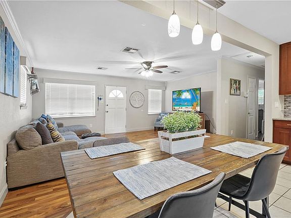 This renovated boasts an open floor plan, a dream kitchen with granite countertops, extra-tall overhead kitchen cabinets, stainless steel appliances including a built in range-oven, microwave, and dishwasher. Ample storage is provided by large bedroom closets, complemented by an indoor laundry room for convenience. Laminate wood flooring and ceramic tile throughout the home, NO CARPETS. The third bedroom offers flexibility as an office or playroom. Outside, the meticulously maintained large backyard with its oversized 10x19 patio, and a decorative pergola for outdoor relaxation. A 13x16 work shed, complete with electricity, provides additional space for hobbies or storage. Enjoy summer days in the partially built-in above-ground pool, surrounded by Weather Tech decking for durability and style. NEW ROOF installed 2024. Peace of mind is ensured with a low-cost transferrable flood policy, while the security system adds an extra layer of protection. The sale includes appliances such as the refrigerator, washer, and dryer, streamlining the moving process for the new homeowners. Don't miss out on the opportunity to make this exceptional property your own – schedule your showing today!