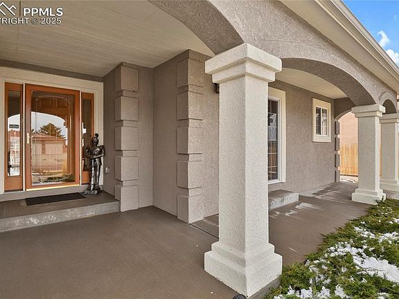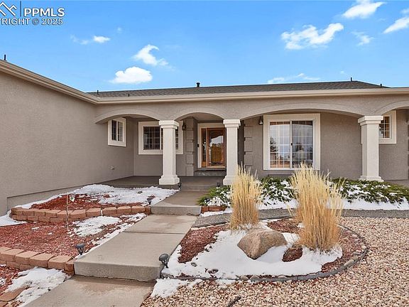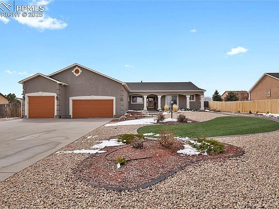 Situated in desirable Paint Brush Hills, this stunning ranch-style home sits on nearly half an acre and offers 4,416 square feet of thoughtfully designed space. With five bedrooms, three full bathrooms, plus an office, it features true main-level living, an open floor plan with vaulted ceilings, and expansive windows with plantation shutters that flood the home with natural light. The spacious kitchen offers ample cabinetry, great counter space, an island, a pantry, and a cozy dining nook. Both areas view the great room with a gas fireplace and a great place for your large widescreen TV. Work in your versatile office with French doors or relax in the cozy living room. The luxurious primary suite offers a sliding door with patio access, just a few steps to your large hot tub. Inside you will find the five-piece ensuite bathroom, a nice walk-in closet along with a secondary closet. To complete the main level, this first floor has two additional bedrooms, another full bath, and a laundry room which includes the washer and dryer and utility tub. Downstairs, the finished basement is perfect for entertaining, with a wet bar, a large rec room with a second gas fireplace, two bedrooms with walk-in closets, and a full bath. An additional room might be used as your art studio or something fun. Outside, enjoy the privacy of your fenced yard with a stamped concrete covered patio aside the hot tub. Entertain and relax with friends at the firepit and make some smores. The backyard includes a shed and the foundation for a new green house. This home has been improved with an additional electrical panel, a whole-house humidifier, radon system, newer roof (10/23), and has RV access on the side. The oversized three-car garage includes a 24 foot deep, third bay. Located with easy access to restaurants, shopping, schools and an easy drive to Schriever Space Force or Peterson AFB. This home blends comfort, style, and convenience. Don’t miss your chance to make it yours!
