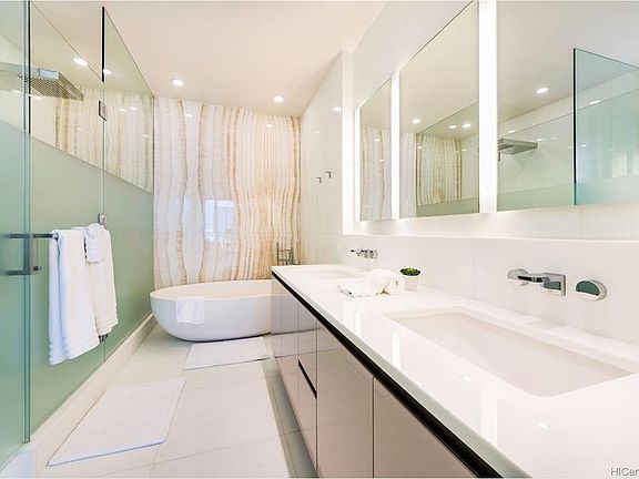 Representing the pinnacle of high-end living on Ala Moana Boulevard, Unit 1203 in Waiea is an exceptional find! The 10-foot ceiling of this one bedroom, two bathroom residence easily invites in fabulous views of the Pacific Ocean and Kewalo Harbor. The Master bedroom has lanai access and a walk-in closet, while the master bathroom features a luxurious freestanding tub. The beautifully appointed kitchen will inspire the chef in you, while the lanai allows you to step out and enjoy the cool trade winds! Lounge in a poolside cabana by the infinity-edged ocean-view pool and hot tub, or dine outside at the resident BBQ pavilion. Amenities include a state-of-the-art fitness center, luxurious spa, dining room, library, theater, ocean view bar and full-time resident specialists.