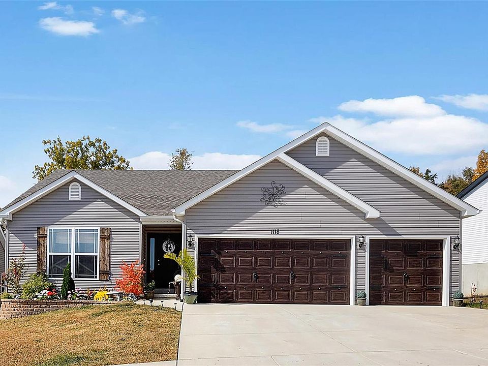 NEARLY NEW FESTUS RANCH! Welcome to this beautiful Augusta Floor Plan, featuring an expansive great room with soaring double cathedral ceilings that create an airy, open atmosphere. This thoughtfully designed home offers three bedrooms, with the master suite conveniently located at the rear for added privacy. Enjoy luxurious amenities in the master bath, which includes a separate tub and shower, a double bowl sink, and an adult-height vanity. The spacious kitchen is a chef's dream, boasting 42" cabinets, a center island with a breakfast bar, and plenty of space for meal prep and entertaining. Since purchase, the Seller added GRANITE counters, a beautiful new deck with retractable awning and tons of landscaping. The unfinished walkout basement comes with a rough-in for a future bathroom, offering endless possibilities for customization. With a three-car garage, you'll have ample space for vehicles and storage.