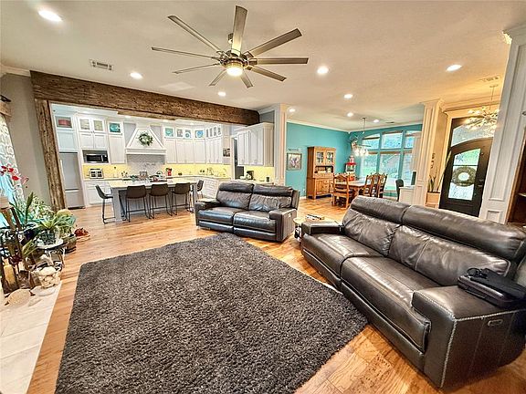 BACK ON THE MARKET! Exceptional luxury property offering style, space, and resort-style amenities. Flawlessly remodeled gourmet kitchen features a large island, walk-in pantry, apron-front sink, built-in breakfast nook, designer tile, and premium appliances—perfect for entertaining. Elegant engineered wood floors throughout; primary suite showcases hardwood flooring, sitting area, patio access, and spa-inspired bath with soaking tub, glass shower, dual granite vanities, and dual walk-in closets. Formal dining offers custom built-ins. Nearly 500 sq ft of exceptional outdoor living space—perfect for entertaining—featuring a full outdoor lounge with fireplace, built-in kitchen and bar, in-ground pool, swinging porch, and ample seating throughout. And don't forget about the 800+ sq ft cabana/pool house that features a full bath—ideal for a guest house, studio, or private gym. Back to the main house, large laundry room with cabinets & room for a second fridge right off the kitchen. Oversized 3-car garage accommodates SUVs/trucks with ease with extra parking in driveway. Recent upgrades include new roof & gutters (2025) and newer windows (~5 yrs). Also in the main house, front guest bedroom includes private bath access and walk-in closet. 3rd & 4th bedroom share a private bathroom with oversized shower, vanity seating and plenty of storage. Main house is 4 bed 3 bath & Guesthouse is 1 bed studio w/ 1 full bath.