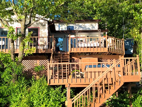 Enjoy the incredible views and privacy of this lake front home in Linn Creek Cove. Check out the virtual tour for this home! Spacious open floor plan with tinted skylights and 4 French doors. Wonderful lake front privacy with the 142' of water front with beautiful sunset views. Spacious multi-level decks and 6 person hot tub. U shaped kitchen with lots of cabinets, breakfast bar and pantry. This home offers 4 bedrooms (2 without closets but does have armoire) and 2 full baths. Upper bath has jetted tub and separate shower. 2 well cruiser dock, attached swim platform and 12 x 4' storage with roll-up bar perfect for happy hour. There is even a single car garage and room to park 6 cars (check out attachment for parking).