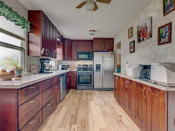 Large lot for in town! 30x40 shop with concrete floor. 5 bedroom home. Close to schools, Rec Center and located at the end of the street. So many great features to this property. Major renovations made by sellers in the past 5 years: remodel kitchen with new cabinets, countertops, appliances, flooring, decking, painting and more. Beautiful new engineered luxury wood flooring. New exterior and interior painted. Newer 50 gal water heater. All appliances were new in past 5 years. New composite deck in front and back deck. Front open deck approx.15x16. 2 baths mostly updated. Seller has done extensive re-landscaping to divert water away from the home as well as added a Beaver Water abatement system. Water softener is owned and will stay. The home does have wiring for a hot tub if a buyer wants to have one. Attached garage is insulated in the ceiling. Seller did add new molding and paintable wall paper in living room. Most all new fans in bedrooms added. New shingles and gutters(seemless) in 2015. Mechanical room/laundry room is approx. 9x14. The washer and dryer staying is located in the metal shed/garage. There is a City access road on East & South side of the property for neighbors.
