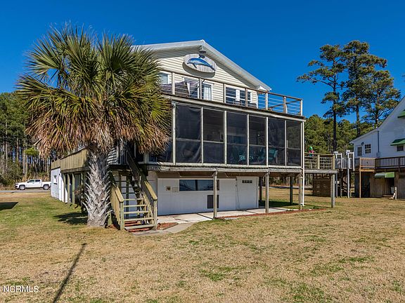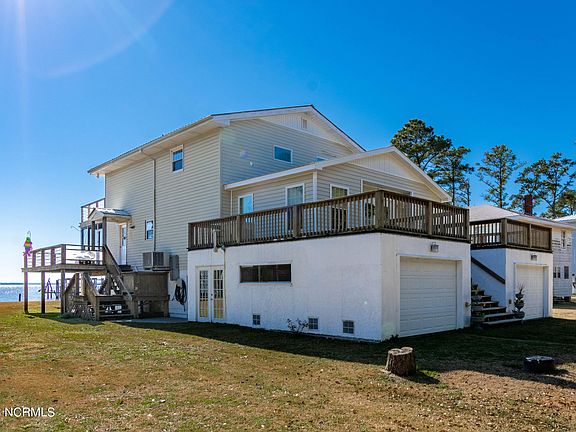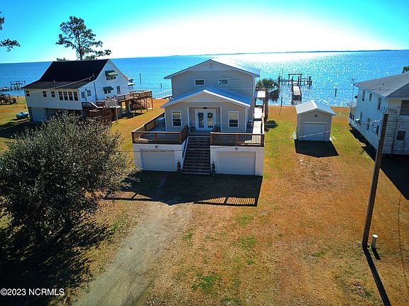 Big water, big views, fantastic sunsets. Looking for a waterfront home with an absolutely breath-taking view? This is your dream spot. Located approximately one mile from the mouth of the Pamlico Sound, this beautiful home overlooks the broadest expanse of the Pamlico River, providing stunning views, along with boating, swimming, & fishing access. House faces south, giving beautiful sunrise and sunset views. Eighty-two feet of fully-bulkheaded waterfront shares a 180-foot pier located on the property line of the neighbor next door, and currently in need of repair from storm damage. House has a roomy 1,016 square feet double-garage flanking the Staircase to the primary level, 336 square feet screened porch, a 336 square foot concrete patio below it, workspace (also with a panoramic water view) occupies 540 square feet on ground floor, and wooden decks totaling 797.4 square feet.. The master bedroom room deck is 336 square feet. Three bedrooms and one full bath upstairs. One full bath downstairs, along with a multi/purpose room (can be den, office, etc.), laundry room with washer, dryer, a second refrigerator, and storage space. Generac 20 Kw whole house generator keeps things humming when a power outage occurs. Runs on propane. 500-gallon underground propane tank also fuels Rinnai tankless water heater installed in 2017, and gas logs (purchased in 2016) in family room fireplace.