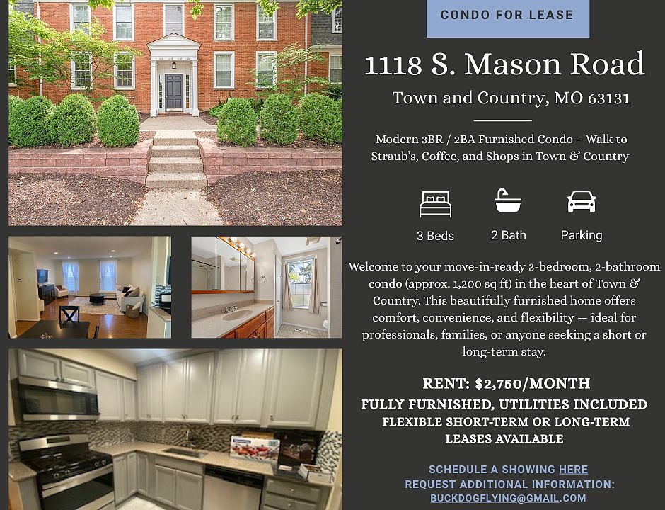 Welcome to your move-in-ready 3-bedroom, 2-bathroom condo in the heart of Town & Country. This beautifully furnished home offers comfort, convenience, and flexibility ideal for professionals, families, or anyone seeking a short- or long-term stay. Prime Town & Country location walk to Straub's, coffee shops, restaurants, and boutiques. Just minutes to highway access, hospitals, and major employers.