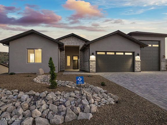 Stunning NEW CONSTRUCTION home located in the highly desirable Yavapai Hills subdivision boasts high energy efficiency, outstanding curb appeal and an attached full length RV garage! Exterior of the home is well appointed showcasing stack stone accents, sand finished stucco, and an expansive paver driveway and walkways. Upon entry you are greeted by an open great room concept split bedroom floorplan, neutral designer color palette, wood grain tile floors throughout, and high efficiency vinyl doors and windows. The great room features soaring vaulted ceilings and a gas fireplace with floor to ceiling stack stone accents, custom mantle, and flagstone hearth. An elegant gourmet kitchen comprised of a Frigidaire wall oven/microwave and CONTINUE