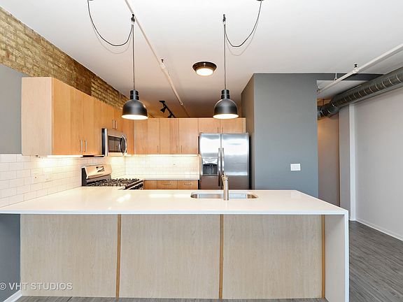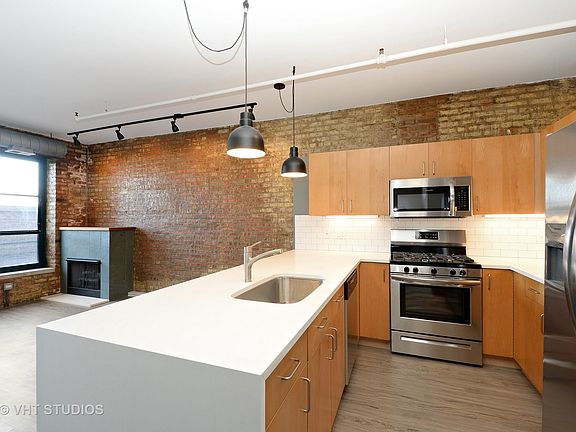 Recently rehabbed, 1bed/1bath in the heart of Fulton Market. This home boast beautiful exposed brick walls, new hardwood flooring, gas fireplace, and a custom kitchen with new stainless appliances, backsplash and quartz counters. Freshly painted with new carpeting in the master bedroom. Designer lighting fixtures throughout. New Seura lighted mirror in the bathroom. Washer and dryer in unit. Brand new water heater. Elevator building with a roof top deck packed with new patio furniture and grills. One heated indoor garage spot and large storage locker included. Steps away from the West Loop, Google Headquarters, shops, cafes, restaurants, and much more. Green/Pink line down the block.