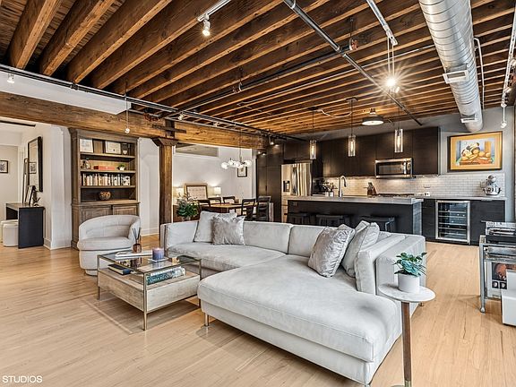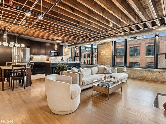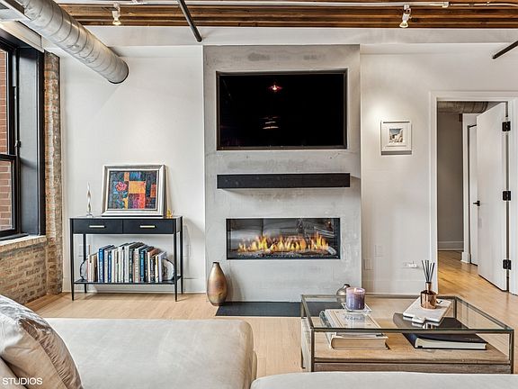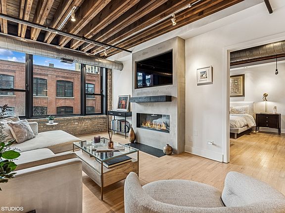 Rarely available designer 2 bed 2 bath timber loft located in the heart of Fulton Market Historic District. Experience West Loop living at its best in this stunning, boutique elevator building loft with an open and light-filled layout featuring all new windows. The West-facing main living and dining area is the heart of this home, with a freshly updated modern electric fireplace, newly refinished hardwood flooring throughout and exposed brick walls to create mix of raw and refined elements for a bold, industrial-chic atmosphere. Designed for both everyday living and effortless entertaining, the spacious kitchen boasts a large eat-in island, stainless steel countertops and all newer stainless-steel appliances, including a wine refrigerator - perfect for hosting or enjoying a quiet night in. With two fully enclosed bedrooms, the split bedroom layout offers both open-concept living and privacy. The generous primary bedroom is complete with two custom built-in closets and an en-suite bath featuring double vanity sink and a glass enclosed shower with tub. The sizable second bedroom offers excellent versatility, and additional custom-built closets easily serving as a home office or guest room with a second, cocktail-lounge inspired bathroom across the hallway. The unit has been thoughtfully upgraded to maximize comfortable living and functionality, including a tankless water heater, new washer and dryer, custom closets throughout, and automatic blinds. Heated attached garage parking is available for an additional $30k. Large additional storage unit in the building is included. The well-maintained building offers a vast shared rooftop deck with multiple seating areas, a dedicated grilling space and stunning city views. Located on Fulton Market, you'll have easy access to the best dining, shopping, and entertainment the city has to offer. Easy highway access and public transportation just minutes away. Don't miss this rare opportunity to own a true loft in one of Chicago's most sought-after neighborhoods.