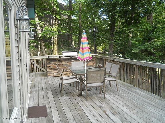 Beautiful Lake Wallenpaupack Estates..Well Maintained Chalet Home with Large Spacious Great Room with vaulted ceilings, Propane fireplace and wood floors. Large dining area that flows into the Kitchen with Granite counters and full Appliance Package. Two bedrooms on main floor with master bath and hall bath. Upstairs boasts 2 more bedrooms, Loft and another full bath. Double front slider doors that open to the spacious front deck with plenty of space to enjoy the days and evenings. Built in Grill with counter for guests to sit and talk to the cook. Full finished lower level,Family room, half bath ,laundry and bedroom. The home has been used as a B&B with much success. See documents.