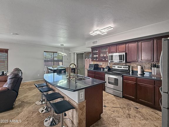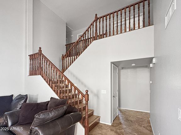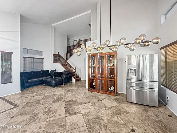 The gourmet kitchen features engineered stone countertops, a travertine backsplash, and an upgraded island. Inside, you'll find premium travertine and marble flooring on the main level and ceramic tile with marble upstairs. A second bedroom and full bath on the main floor are perfect for guests or multi-generational living.. Upgraded light fixtures, wooden blinds, and ceiling fans enhance every room. The extended garage includes built-in cabinets for extra storage, while the RV gate and extended driveway provide easy access for recreational vehicles. An enclosed loft adds flexibility as a sixth bedroom or home office, and a built-in desk and laundry sink with cabinets offer even more functionality.