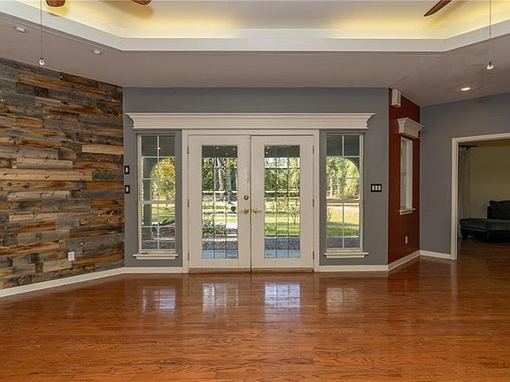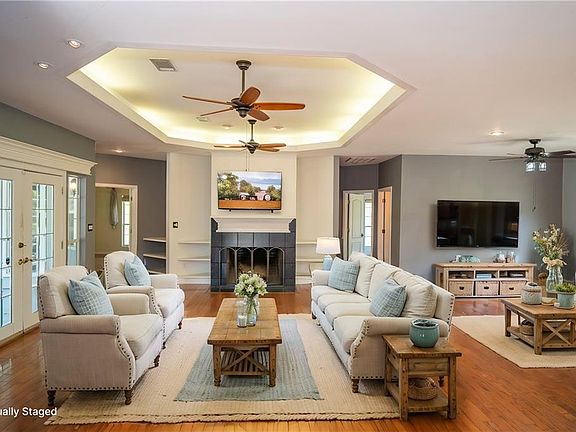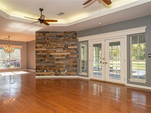 This 3-bedroom, 3-bathroom country home offers over 5 acres of high & dry land, mostly cleared, great for those seeking privacy and space. The open, triple split floor plan ensures both comfort & seclusion. Upon entering through beveled glass French doors, you're welcomed into a living room that features a wood-burning fireplace, staggered built-in shelves, a wood plank accent wall, & recessed ceiling with crown molding lighting. The space seamlessly connects to the breakfast, kitchen, & dining area, making it great for gatherings. With no carpet in the home, the living areas and bedrooms has laminate wood floors, and tile in the kitchen and bathrooms. The kitchen offers abundant cabinet space, a new downdraft GE Profile glass cooktop, wall oven, & a spacious walk-in pantry. The master bedroom is large with a tray ceiling, sitting area, and an en-suite bath featuring two vanities, a jetted tub, a walk-in tile shower, and two walk-in closets. The front guest bedroom has its own bathroom, while the back guest room features a raised ceiling and a walk-in tub, granite tile countertops, and updated fixtures. Outside, the property includes a 2-year-old covered metal carport on a concrete pad, suitable for a shop or storage. A large concrete patio, an arbor with a working pitcher pump, and a 500-gallon propane tank connected to a 17 KW generator add to the functionality of the space. The property is littered with fruit, herbs, berry, and citrus plants. Meticulously maintained, the home features a 2.5-year-old architectural roof, new vinyl fascia and soffits, and an updated main waterline. Excellent drainage is ensured by a trenched border around the property. Notably, the home does not require flood insurance, providing extra peace of mind. With updated ceiling fans, lights, and hardware throughout, this move-in ready home offers the perfect blend of rural charm and modern amenities.