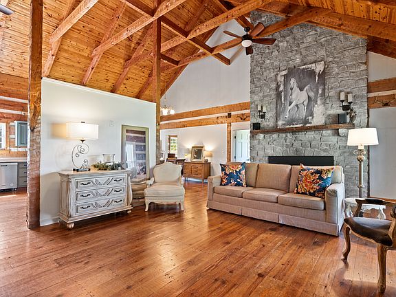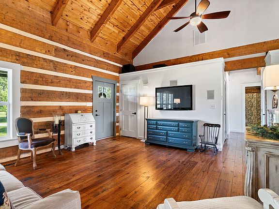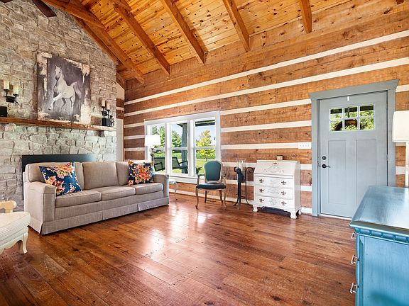 Your dreams of rural living in a charming chalet-style log home are ready to come true! Situated on 6 acres with Sugar Creek *on site,* you'll enjoy both scenic views of expansive fields AND wooded terrain with kayaking just outside your backdoor! An oversized front porch makes a great first impression and serves as a perfect outdoor living area. Inside you are amazed by 23-foot soaring ceilings with open, exposed framework. Imagine your favorite lodge - this is it! Open concept main living/dining/kitchen areas are perfect for large family gatherings. This home is incredible during the holidays (ah-hem... HUGE Christmas tree opportunity)! An impressive floor-to-ceiling masonry fireplace is the focal point and features a blower insert that can heat your whole home in the winter if you desire! Gourmet kitchen with a cooktop and separate ovens plus a pantry - not to mention an oversized overflow pantry around the corner. Incredible storage! The primary suite is split from the spare bedrooms and offers tall ceilings that carry throughout, an enormous walk in closet and full en-suite bath with linen storage. Spare bedrooms are generous in size and adjacent to an updated full bath. Last but not least your expansive sunroom makes for the perfect flex room - great for a home office/hobby room/playroom/home gym... endless possibilities. The sunroom opens onto the rear porch and is just steps away from the 2 car garage. This outbuilding not only serves as a garage but also has a separate bonus room currently being used as an office. Great way to keep home life and business life separate! The 2nd outbuilding is even larger with both workshop/garage space and the most amazing "man cave" space! Heated too!! Previous owners outfitted this building with a bathroom and a kitchenette! Perfect opportunity for a home-based business! Updates include new HVAC, almost all new windows and brand new metal roofing with a 50 year transferrable warranty!