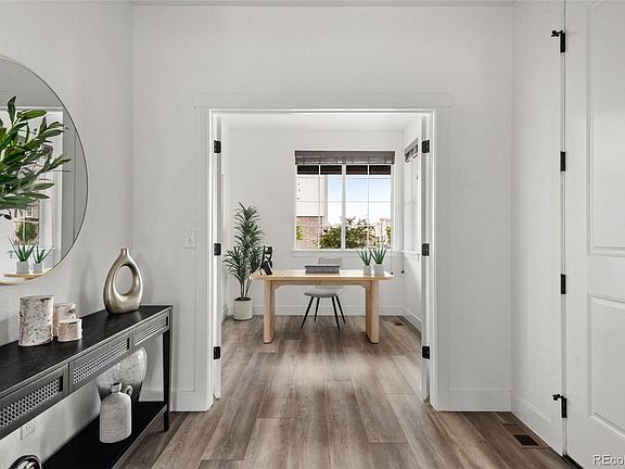 This stunning, nearly new modern home sits on a spacious corner lot and blends thoughtful design with easy, low-maintenance living. From the moment you step onto the covered front porch, you'll notice the attention to detail—from the freshly painted exterior (2024) to the permanent holiday lights that wrap the home in year-round charm. Inside, the bright, open layout features a sleek kitchen and custom butler pantry—ideal for everyday living and entertaining. The Kitchen features quartz counters, stainless appliances, large kitchen island, and natural light throughout. The Dining space is spacious and can easily fit an eight-person dining table. The open concept Living Room is flooded with natural light, and has a custom fireplace wall. Upstairs, the newly upgraded luxury vinyl plank flooring flows through the primary suite, hallways, stairs, and a basement bedroom, tying the spaces together. The Primary Suite features high vaulted ceilings, room for a reading nook, and flows seamlessly into the Primary En-Suite which is a full five-piece bath. The primary closet has been customized with custom built-in closet system, and faux white marble tile for a clean, luxe feel. The backyard is built for Colorado living: Turf and rubber mulch keep things effortless, while a stamped concrete patio, built-in gas line (with hookups for a grill, fire pit, and future patio cover), and custom garage setup (designer luxury concrete finish on the garage floor, wall-to-wall slatwalls) give you both function and flexibility. The home features Phillips Hue Lighting throughout, Solar Panels (leased), and dual A/C units add comfort and efficiency to this well-rounded home. This home is only one mile to the Light Rail. Recent updates: New Carpet (2024), and new Luxury Vinyl Plank (2024), HVAC Cleaned and Serviced last month. Roof "Tune Up" with 5-Year Roof Warranty done last month. Best feature yet: Assumable VA Loan 2.50% Interest Rate. Don't wait! This home is a gem!
