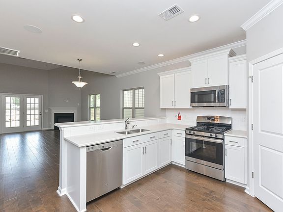 This in-demand Townsend has three spacious bedrooms, two-and-one-half baths, two-car garage, and the master on main. Large dinette area encourages gracious meals, and the family room with its cozy gas fireplace invites you to stay and visit. Open kitchen features lengthy quartz bar top, recessed lighting, and stainless steel appliances. The master boasts vaulted ceiling, comfort height double vanity, and private bath with separate garden tub and shower. Creature comforts include Bluetooth technology with ceiling speakers, hardwood stairs with metal balusters, crown molding on first floor, garden door to back covered-porch with a built-in shed, and an amazing bonus with closet (could be fourth bedroom). Irrigation system and garage door openers are included.