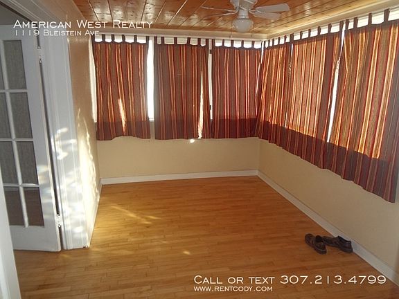 SCHEDULE A SHOWING ONLINE AT: showmojo.com/lh/c9727fa063 Single level home located close to downtown Cody. Fully fenced back yard, long driveway and additional parking on the street. Home has an enclosed porch ideal for reading, hobby, or play room. Large living room with free-standing gas fireplace. Two nicely sized bedrooms with a full bath between. Kitchen is spacious with a dining area in the back. The back yard is fully fenced. Pet negotiable for additional rent and/or deposit. A basement room provides ample storage. Ceiling Fan Fencing Fully Fenced Flooring Hardwood Heat Gas Fireplace Kitchen Refrigerator Kitchen Stove / Oven Utility Black Hills Energy Utility City Of Cody (Water, Electric, Sewer, Trash) Washer/Dryer Hookups