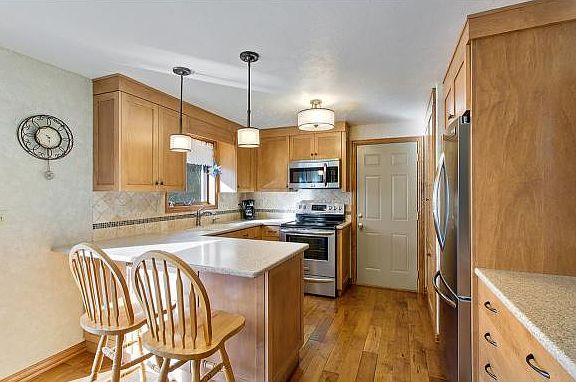 Beautiful home in highly sought after area w/many updates. Spacious 4 bdrm, 2 bath split-level w/gorgeous maple hdwd flrs in LR, dining, kitchen, mstr bdrm. Updated custom maple cabinets, countertops, backsplash, lighting. SS appli pkg. Patio drs to lrg deck overlooking park-like yard w/creek. Finished LL w/FR feat: F/P, built-ins, Bdrm, bath, laundry. C/A. Roof 2012.