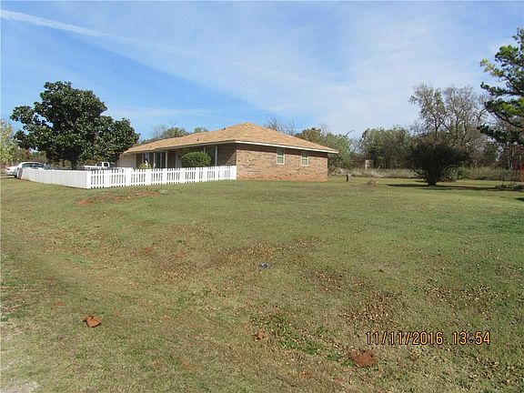 Where the deer and the turkey roam!!! Lovely home on two lots/almost 2 acres. Beautiful new flooring in entry, living room, kitchen, and hallway. New carpet in master bedroom. New ceiling fan in large living room with fireplace. New paint in living room and hall. New well pressure tank and water softener. Roof only a year old. Updated kitchen with oak cabinets and pull-out drawers. Newer appliances all stay including stainless steel side-by-side refrigerator, double oven stove, microwave, dishwasher, garbage disposal, and large capacity HE washer & dryer. New sink and faucets in hall bath. Master shower replaced in 2009. All windows replaced (except picture window) in August 2010 with double-hung thermal barrier windows. Property also has four storage buildings and storm shelter. Close to I-44, HE Bailey Turnpike, OKC, and Norman. Quiet neighborhood. Home is pre-wired for generator and RV hook-up!!!