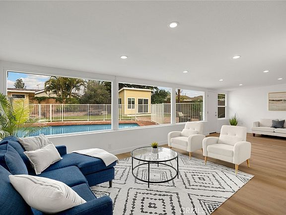 Rarely does a fully remodeled 5-bedroom home on a quarter acre with 2 primary suites, become available in this highly desirable Orange neighborhood near Villa Park, offering nearly 2,300 sq ft of single-level, step-free living ideal for multigenerational families. The spacious backyard includes a fenced pool, lawn, brick patio and 2 detached office pods. The open-concept layout is anchored by a stunning kitchen featuring a large island, breakfast bar, new stainless-steel appliances, custom subway-tile backsplash, quartz countertops, shaker cabinetry, extra storage cabinets, and a built-in desk with a window view, flowing into the living, dining, and family rooms that feature oversized windows and overlook a sparkling fenced pool. Upgrades include New: LVP flooring, windows, doors and moulding, fresh texture and paint, recessed lighting, ceiling fans, closet doors, fixtures, designer-tiled baths with frameless showers, and garage door. The generous lot offers a large front lawn with room to expand, a long driveway, back patio, lawn, raised garden, citrus trees, a pool equipment shed. Close to Old Towne Orange, Chapman University, the acclaimed Villa Park School District, and the upcoming redesigned Village at the Orange Mall, top shopping and dining, freeways.
