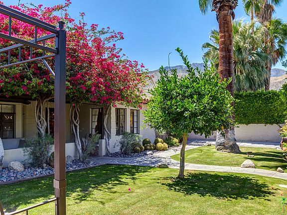 Gorgeous authentic 1936 Spanish home with guest house oozes incredible warmth, charm and character. Walled and gated mini-estate with tiled roof on a quiet street in the heart of Movie Colony East, steps to Ruth Hardy Park and a short walk to the Uptown Design District. Cozy living room with fireplace, split floor plan of two bedroom suites, beautiful kitchen open to dining area and morning room, french doors to private outdoor paradise with colorful lush landscaping, saltwater pebble-tec pool and spa with waterfall, outdoor fireplace and beautiful mountain views. Separate charming one bedroom/bath guest house with kitchen, fireplace, and private patio. Furnishings available outside escrow. This classic Palm Springs Spanish treasure is a must see!