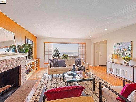 This home has unusually generous Bay and Golden Gate views (thanks to undergrounded wires) flanked by beautiful sliding shoji screens. The spacious living room has wide plank oak floors, a fireplace and beechwood shelves. It flows easily into a dining area with a built-in cabinets and access to interior patio.. The upgraded kitchen with beechwood cabinets and cork floors also leads directly out to that same sheltered patio which is perfect for entertaining and playing. In addition to the three bedrooms and two baths, there is a bright bonus room across the back of the house that looks out at the gentle hillside with fruit trees. This lovely room can be used as an office, studio or playroom. The house has a large two car garage and storage room. It has been recently painted inside and out and had the floors done among other things. Come see, come swoon!
