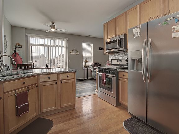Fantastic and stylish 3 Bedroom townhome adjacent to open space! Beautiful hardwood Entry and Kitchen, and luxury vinyl flooring on the main level! Wide slat blinds and stylish window treatments throughout make this a move in ready home! The upgraded Kitchen features 42" cabinets, granite countertops, and glass tile mosaic backsplash! The microwave is only a year old! The spacious Master Bedroom with vaulted ceiling, ceiling fan with overhead light, AND 2 Closets including a walk in! Bedroom #2 also has a walk in closet and lighted ceiling fan! Bedroom #3 features custom closet shoe shelving which is removable and lighted ceiling fan! Both Bathrooms boast comfort tall toilets which are only a year old. The main Bathroom tub surround is only 4 years old! Convenient 2nd floor Laundry with storage cabinet and shelving! 6 panel doors throughout! You'll love the expanded patio with added pavers, privacy fence, perfect for viewing the adjacent open green space! Great 2 car attached garage with water hookup in the closet. This home is in excellent condition and has been well maintained. Make your appointment today!