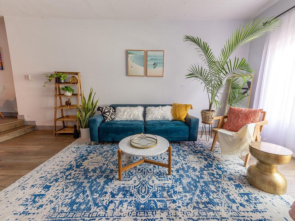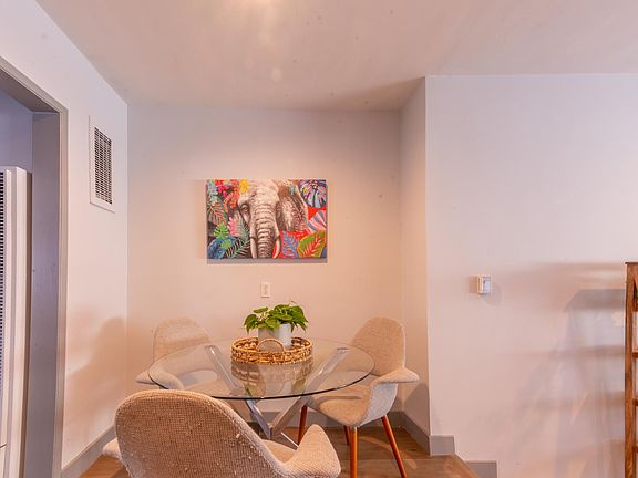 The spacious master bedroom is designed for ultimate comfort, with plush down linens and a cozy comforter, complemented by ample storage space. Enjoy meals at the modern round dining table, surrounded by art and lush plants that bring life to the space. More than just a home, this residence offers a contemporary haven where comfort and style meet, right in the heart of Santa Monica.
