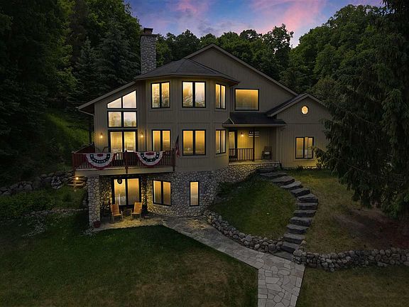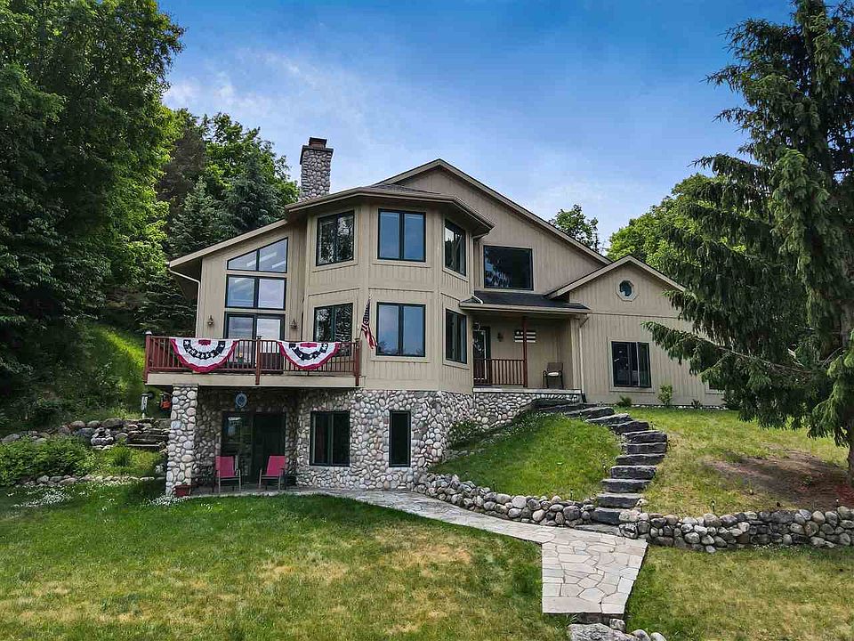 Looking for that property that has it all....well wait no more! This 4 bed, 3.5 bath home boasts 3,200 sq. ft., panoramic views of the shimmering waters of beautiful Lake Charlevoix, and 50' of private waterfront with a dock and an 85' out lot by the waterfront for your own little beach cabana! The stunning architectural lines of the home will draw you in and have you loving every aspect, from the vaulted ceiling of the "happy room" off the kitchen and dining area, to the stone façade, and the three levels of living, there is something for everyone. With views from most rooms in the home, the wine cellar in the lower level, the 1.8 acres of property, lots of room to recreate outside as well as by the water, and the large party deck off the back of the home, this one really does have it all! Hurry for your tour of this fabulous opportunity!