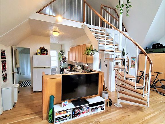 Spacious loftHigh ceilingsHardwood floorsNatural lightUnique spiral staircase
