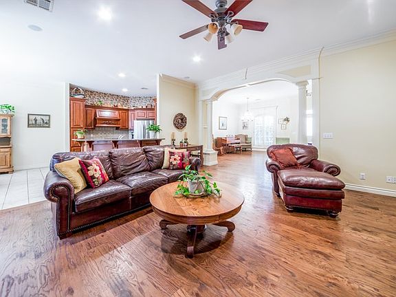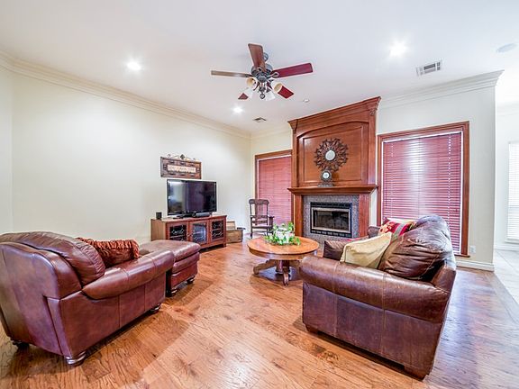 Popular Pecan Hill! This well maintained home was built in 2000 and has over 2100 sq ft. The 4 bed 2.5 bath sits facing East & West with the back yard facing East. It features beautiful thick crown molding, tray ceilings, hand scraped wood floors, open floor plan with split bedrooms. Central vac and some updates in the last 3 to 5 yrs include- Kitchen- granite counter tops, stainless steel appliances, sink, garbage disposal & faucet. Master Bathroom -hand in-layed tile stand up shower with privacy glass door, faucets, etc. Most recent in 2018 - New carpet in bedrooms (Stainmaster/pet protected 25 yr). Hand scraped wood floors. Interior has been painted in several rooms. THere is a 50 gal hot water tank. HVAC is serviced annually and also has a new condenser & fan motor as well. 2018 springs & cables were replace in garage door by Overhead door. House also features a plethora of large windows for lots of natural light. A fireplace with mantel as well as a formal dining room to be used as you would like. Plenty of counter space in kitchen as well as eating bar! Storm shelter located in garage. Call to see this home!(Washer & dryer stay but are not warranted.)