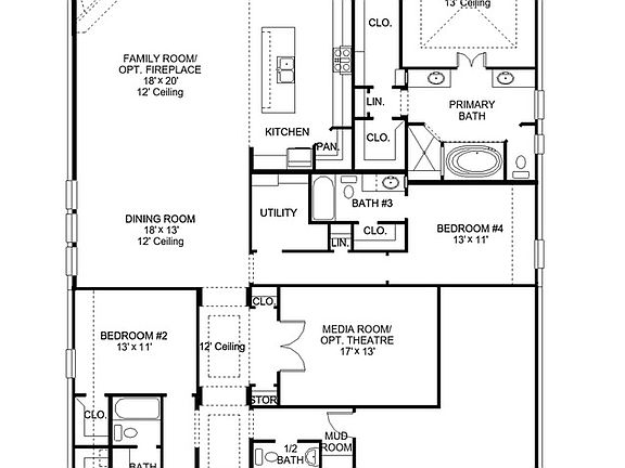 Home office with French doors set entry. Media room with French doors off extended entry. Formal dining room flows into open family room with wall of windows. Kitchen features corner walk-in pantry and generous island with built-in seating space. Adjoining morning area features wall of windows. Primary suite includes double-door entry to primary bath with dual vanities, garden tub, separate glass-shower and two walk-in closets. Guest suite offers private bath. High ceilings and abundant closet space add to this spacious four-bedroom design. Covered backyard patio. Mud room off three-car garage.
