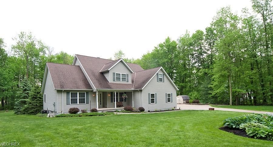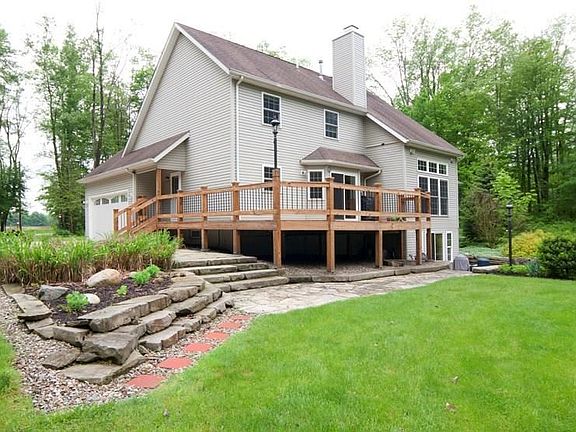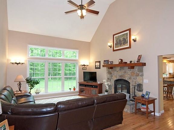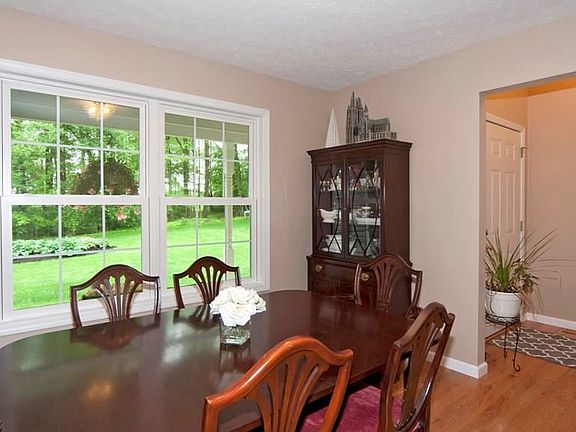 Stunning Cape Cod with many updates! This home has newer hardwood flooring throughout the great room, dining, foyer, kitchen, bath! First floor master suite and spacious master bath and jetted tub. Great room has a soaring ceiling and stone fireplace with wood burning insert. Kitchen is a delight: granite counters, breakfast bar with stone detail and sunny breakfast room. Formal dining is freshly painted with large window letting nature in!! This home has 3 additional bedrooms up with a bonus room for large office or 5th bedroom. Finished lower level with full bath walks out to stone patio. Lower level family room has a wood burner w/coal insert for clean burning all winter. Newer fabulous deck off the kitchen overlooks this open 2.14 acre lot with wooded views. First floor laundry plus additional parking and outdoor storage shed. Don't miss this one!