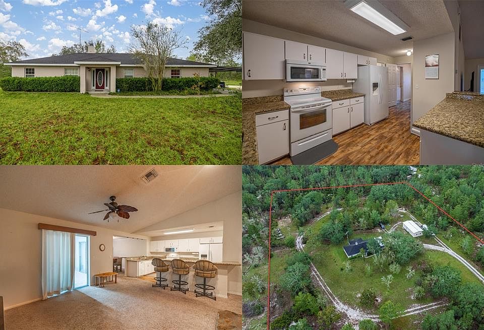 Discover the perfect blend of country charm and modern comfort on this incredible 4.59-acre property in Bronson, FL! Zoned A1 with no restrictions, this private, fully wooded retreat offers endless possibilities. The spacious 3-bedroom, 2-bathroom home boasts an open-concept floor plan, including a versatile office/den. The kitchen is both roomy and functional, featuring a cozy seating area, elegant white cabinets, and a beautiful granite countertop. Enjoy family gatherings around the inviting wood-burning fireplace, which flows seamlessly into the main living area. Step out to the enclosed porch with its own AC unit for year-round enjoyment. As an added bonus, a large 1,100 sq. ft. shed on the property offers ample space for a workshop or can easily be transformed into a barn. Embrace the tranquility of country living with modern conveniences in this unique Bronson property—your dream lifestyle awaits! Short drive to Ocala and the World Equestrian Center! ROOF 2012, HVAC 2023 & WELL PUMP 2024!