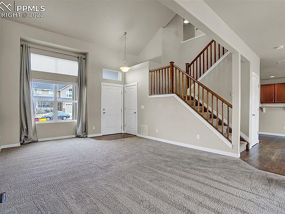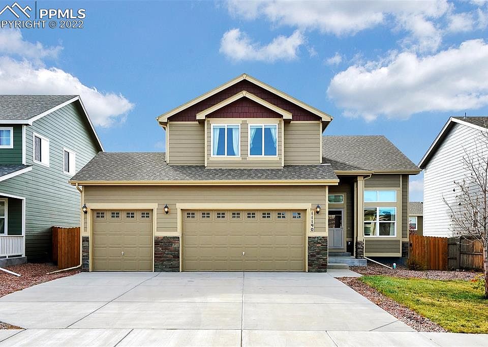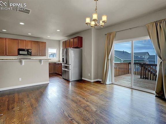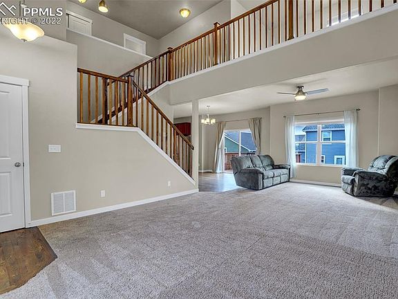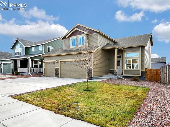 Beautiful & well kept home! This home boasts a three car garage, front & back landscaped & has a view of Pikes Peak. You're greeted as you enter this home with open living space, vaulted ceilings & beautiful flooring throughout. The spacious kitchen has hardwood floors, granite counter tops & is very well designed for kitchen activities while entertaining. The deck opens up to a fully landscaped backyard flowing down the stairs to the yard you'll come upon a beautiful brick gas fed firepit where you can entertain on those amazing Colorado summer evenings. Upstairs there are 2 large bedrooms, a loft & the master suite with a walk-in closet a 5-piece luxury bathroom & sitting area. To eliminate the electric bill, this home has solar panels installed on the roof! In great condition & move-in ready! Don't miss this one, it'll go quickly!