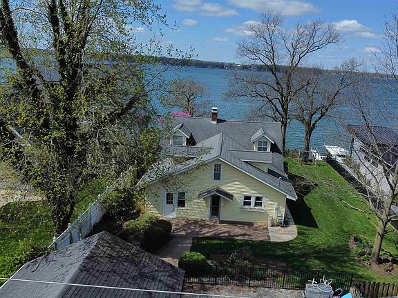 Stunning sunset and sunrise views of Lake Wawasee can be yours! This 90 year old, spacious Waveland Cove home is livable for this summer while you line up a contactor to build new or renovate. The extra large 75 feet of lake frontage provides a premier, sandy beach. BrockDock pier and lakeside deck add to your pleasure. The 5 bedroom, 1 1/2 bath home has a separate dining room, nice kitchen, large lake view windows in spacious living area and downstairs bedroom. Another downstairs bedroom can be used as an office with separate entrance. Upstairs are 2 sizeable bedrooms and a big bonus room. A garage and shed are included on this deep, nicely fenced lot. This is a location many dream about. Don't miss out.