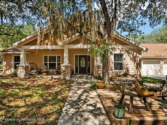 This custom-built home is truly a gem nestled on a 1.7-acre parcel adjacent to the Chassahowitzka National Wildlife Refuge offering a plethora of desirable features & advantages. Property Highlights: Privacy - Fully fenced/cross-fenced property with electric wrought iron entry gates, ensuring security and privacy. Driveway/Parking - Concrete circular driveway and walkways provide easy access, 12x26 RV carport (formerly a stable), & a detached 1-car garage/workshop, offer ample parking and storage space. Home Features - The interior boasts a spacious open floor plan highlighted by large bedrooms, double-pane windows for energy efficiency, surround sound system, and dimmer lights throughout adding ambiance. Crown molding adds a touch of elegance, while 4' foam insulation throughout, including the attic, ensures comfort and energy efficiency year-round. Garage/Storage: A convenient breezeway connects to an oversized 2.5 car garage, complete with an insulated attic & offering ample storage space. Exterior Charm - Enjoy the peaceful setting from the inviting front porch, ideal for starting your day with coffee and the tranquil sounds of the nearby fish pond waterfall. The exterior is beautifully accented with stone details, composite siding, and sturdy concrete columns, ensuring both durability and aesthetic appeal. Additional Benefits - No flood insurance required & no HOA fees. Located conveniently off US Hwy 19, between the Weeki Wachee River and Homossassa Springs, & just minutes from the Gulf of Mexico, it provides easy access to a variety of outdoor activities such as kayaking, fishing, boating, and hiking trails. This makes it an ideal location for outdoor enthusiasts looking to explore and enjoy nature. Overall, this custom-built home combines luxurious living with practical amenities in a serene natural setting, making it an exceptional retreat that offers both comfort and opportunities for outdoor activities.